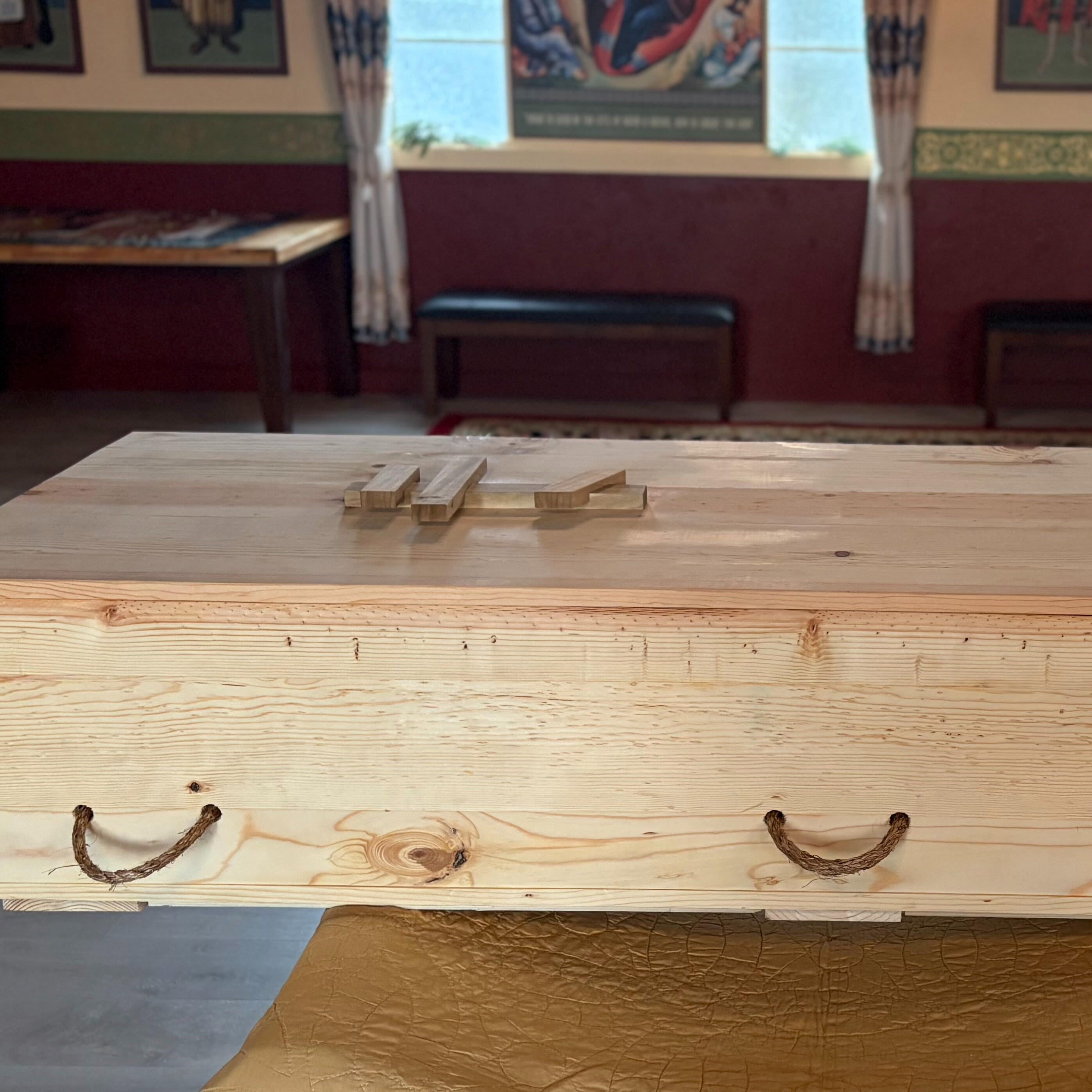 Our caskets are made of pine, finished with mineral oil, have 6 manila rope handles and come unlined.