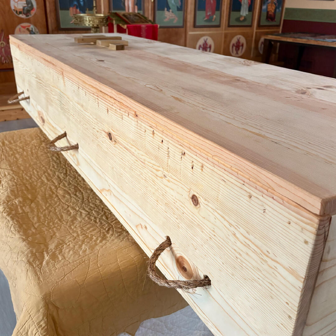 Our caskets are made of pine, finished with mineral oil, have 6 manila rope handles and come unlined.